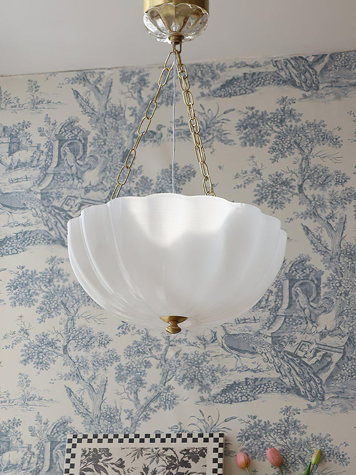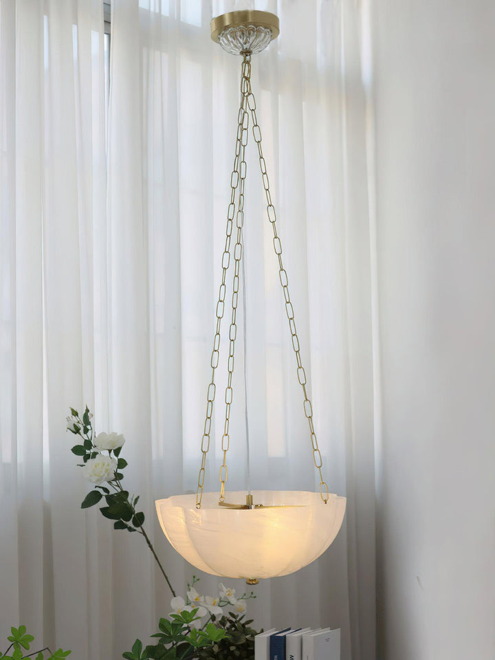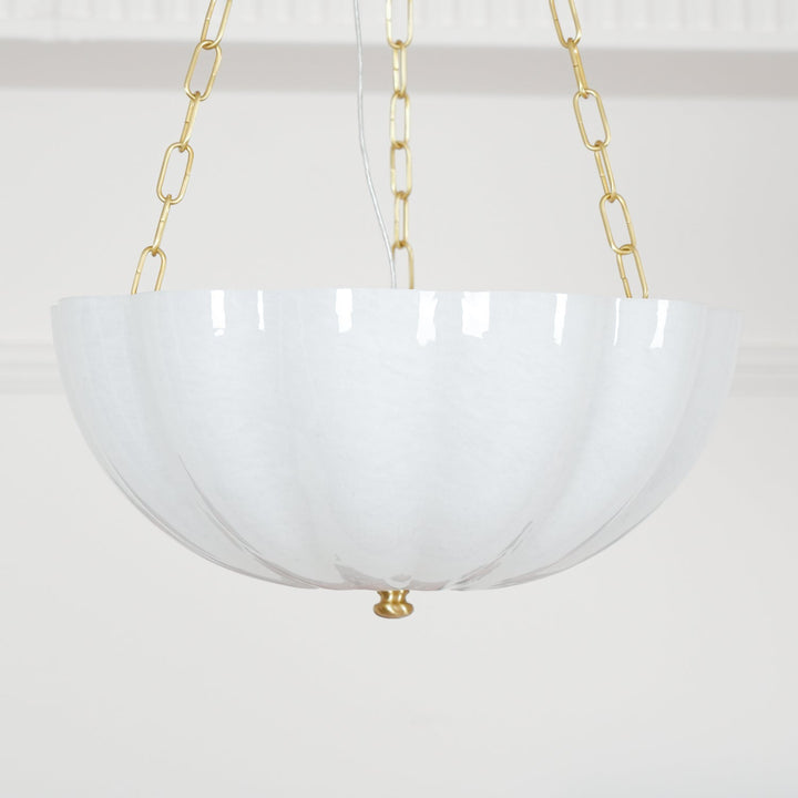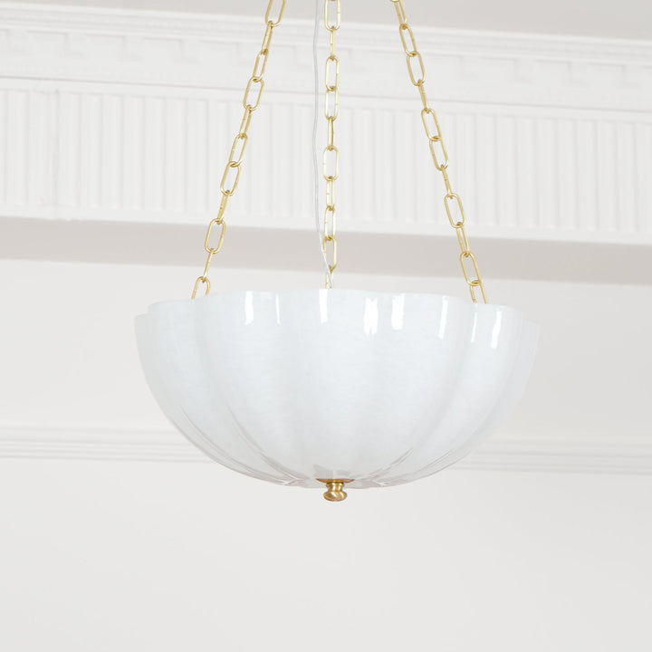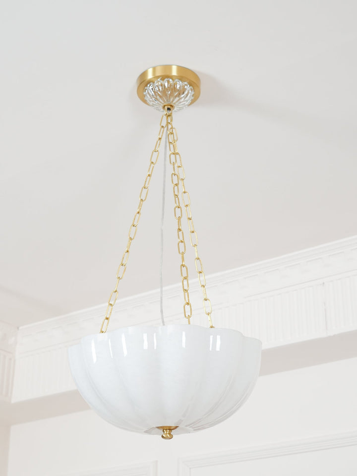 With hints of art deco, the traditional charm of the Rosehill Chandelier can be seen throughout. Known for her blending of old-world charm and modern sensibility, the chandelier is comprised of iron fixtures, chain link, and canopy, along with a flowing glass shade that hangs from it. Light diffuses through the glass in an ambient cast while the remainder bounces off the ceiling above.