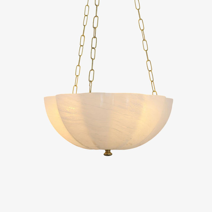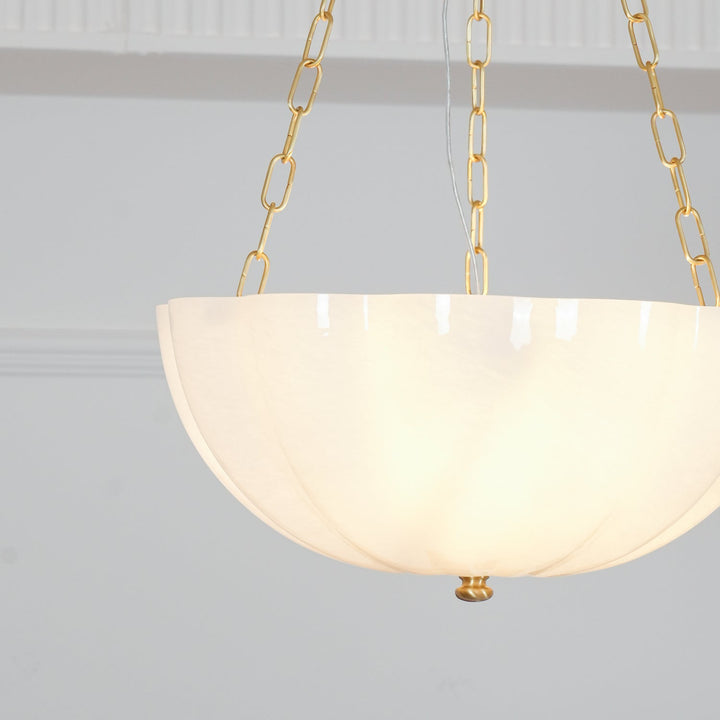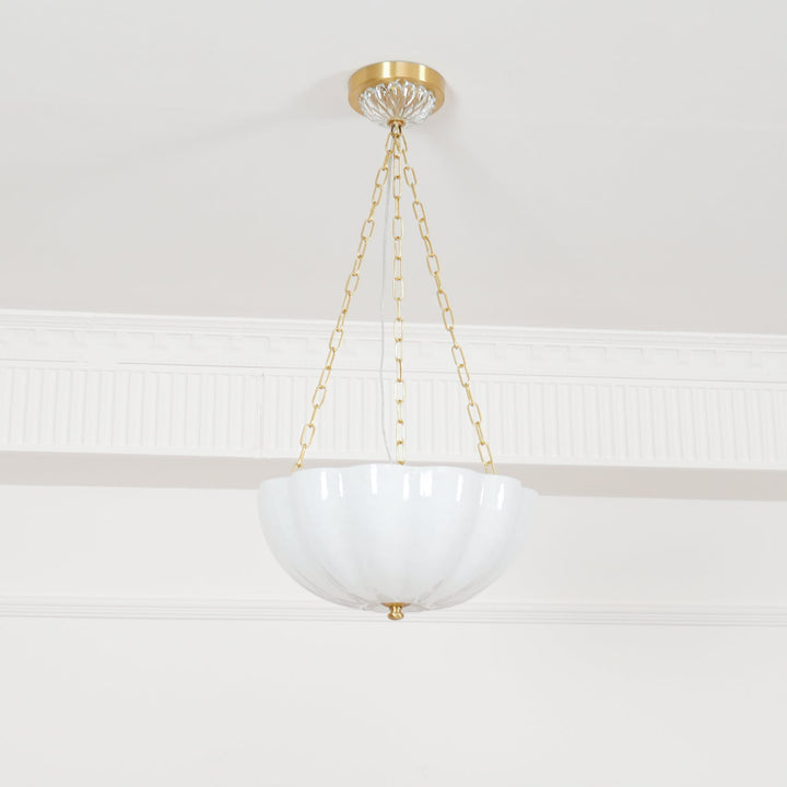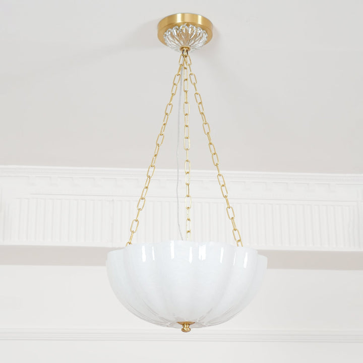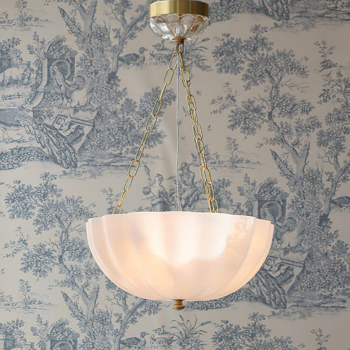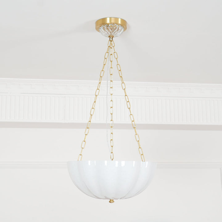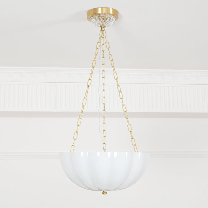 With hints of art deco, the traditional charm of the Rosehill Chandelier can be seen throughout. Known for her blending of old-world charm and modern sensibility, the chandelier is comprised of iron fixtures, chain link, and canopy, along with a flowing glass shade that hangs from it. Light diffuses through the glass in an ambient cast while the remainder bounces off the ceiling above.