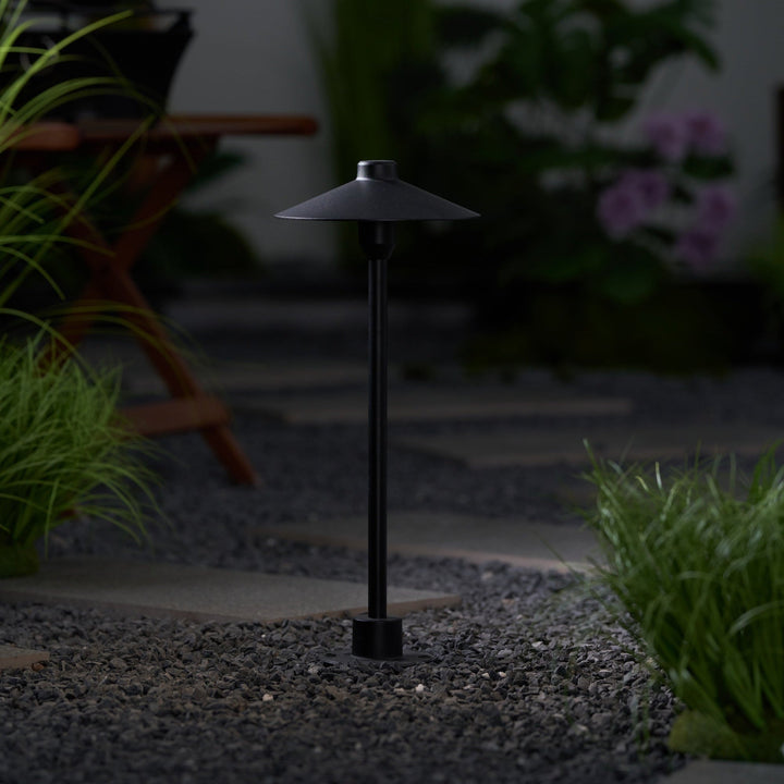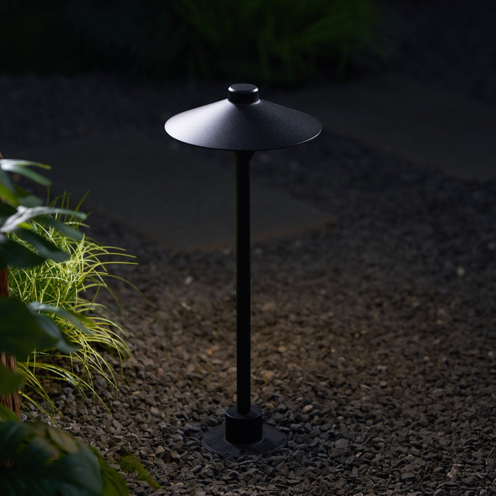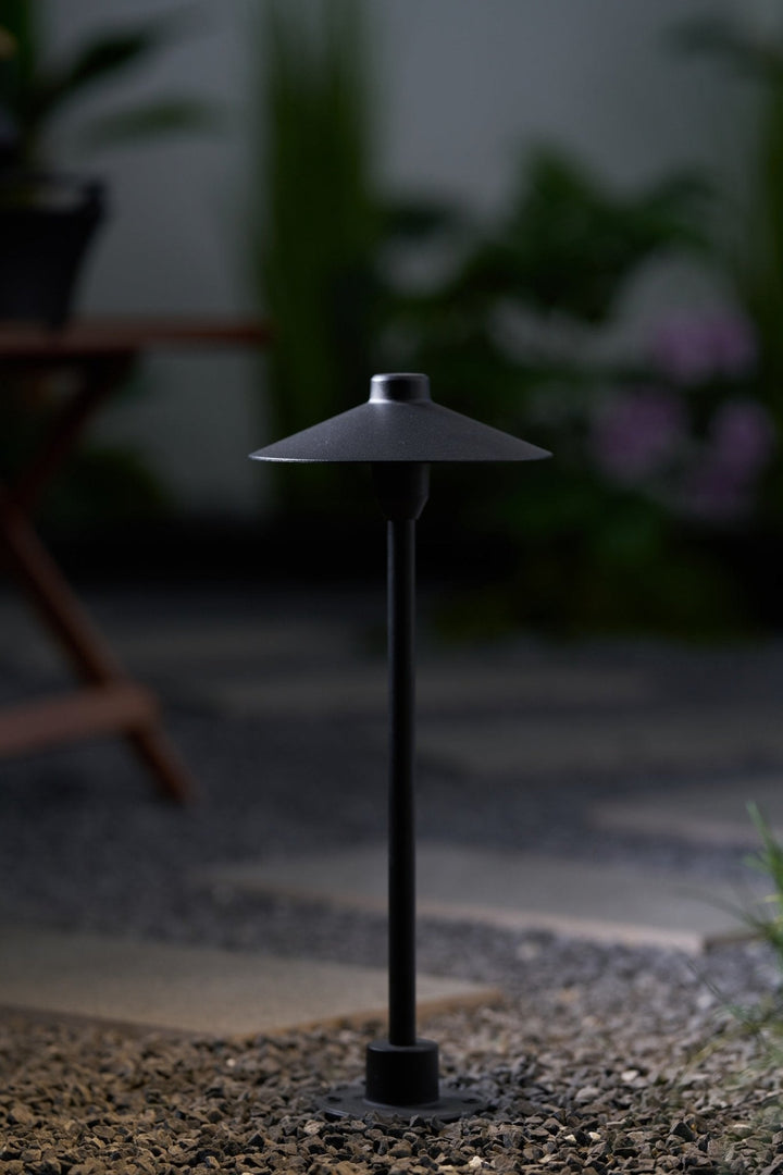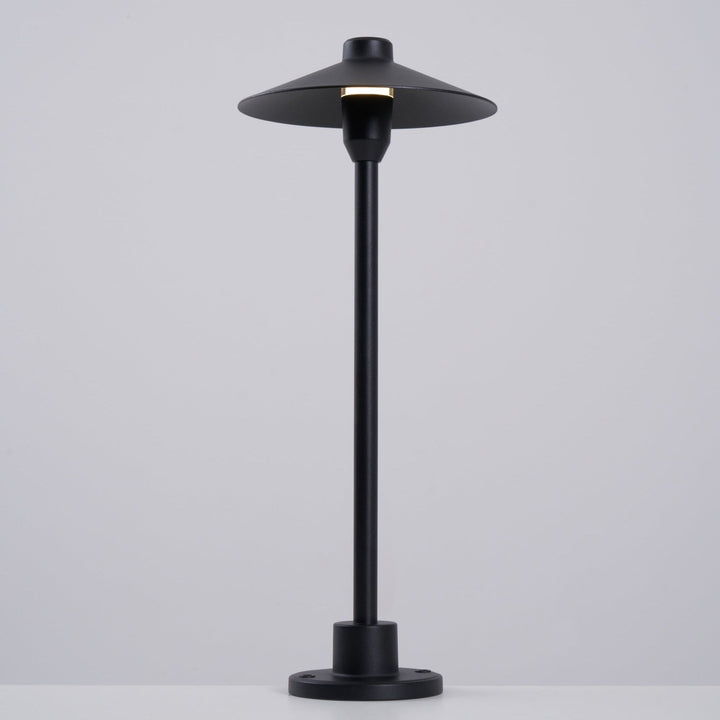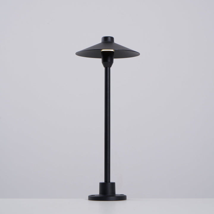 The Shadowcap Path Light is a minimalist outdoor lighting fixture inspired by the simplicity of traditional lanterns and the precision of modern design. Its slender black stem supports a conical cap that casts a downward glow, providing focused illumination for pathways, garden trails, or driveways. The sleek matte finish ensures it seamlessly blends into both natural and architectural landscapes. Built for durability and style, this path light offers a subtle yet striking visual presence—perfect for guiding the way with understated elegance.