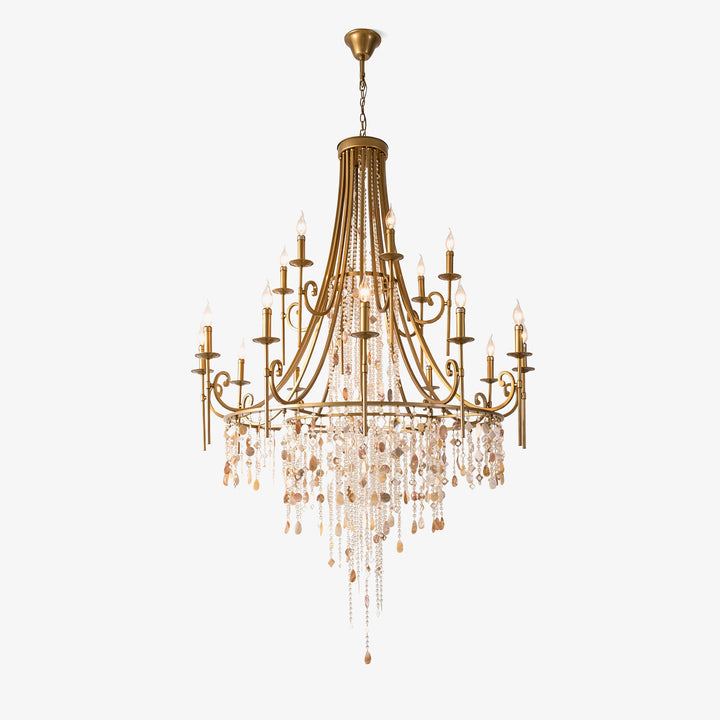 Introducing the Tatum Lux Shell Crystal Chandelier. Inspired by the captivating beauty of waterfalls, its golden frame is adorned with cascading crystal bead chains, exuding a luxurious and majestic ambiance. With its soft yet brilliant glow, this chandelier will elevate any space with elegance and radiance.