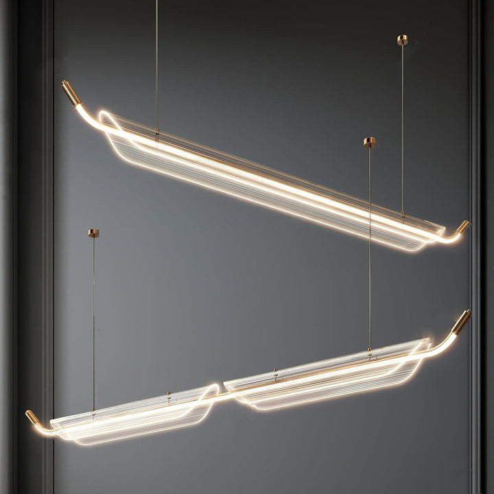 This modern and minimal Two Boats Acrylic Pendant Light is a perfect addition to your living space. Expertly crafted with high-quality materials, it features two sleek boats suspended from a long strip of light fixtures which are bound to bring a contemporary look to your home or office. The stylish design and unique shape allow it to blend into any decor. Bring modern lighting to your space with this stunning pendant light.