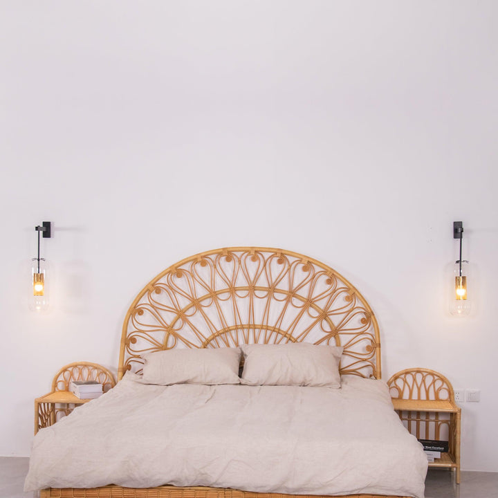 The majestic Vadim wall lamp sports a generous glass body which contrasts with its fine steel rod. Suspended in the air, the perforated cage emits a soft light and projects graphics reflections on the walls.